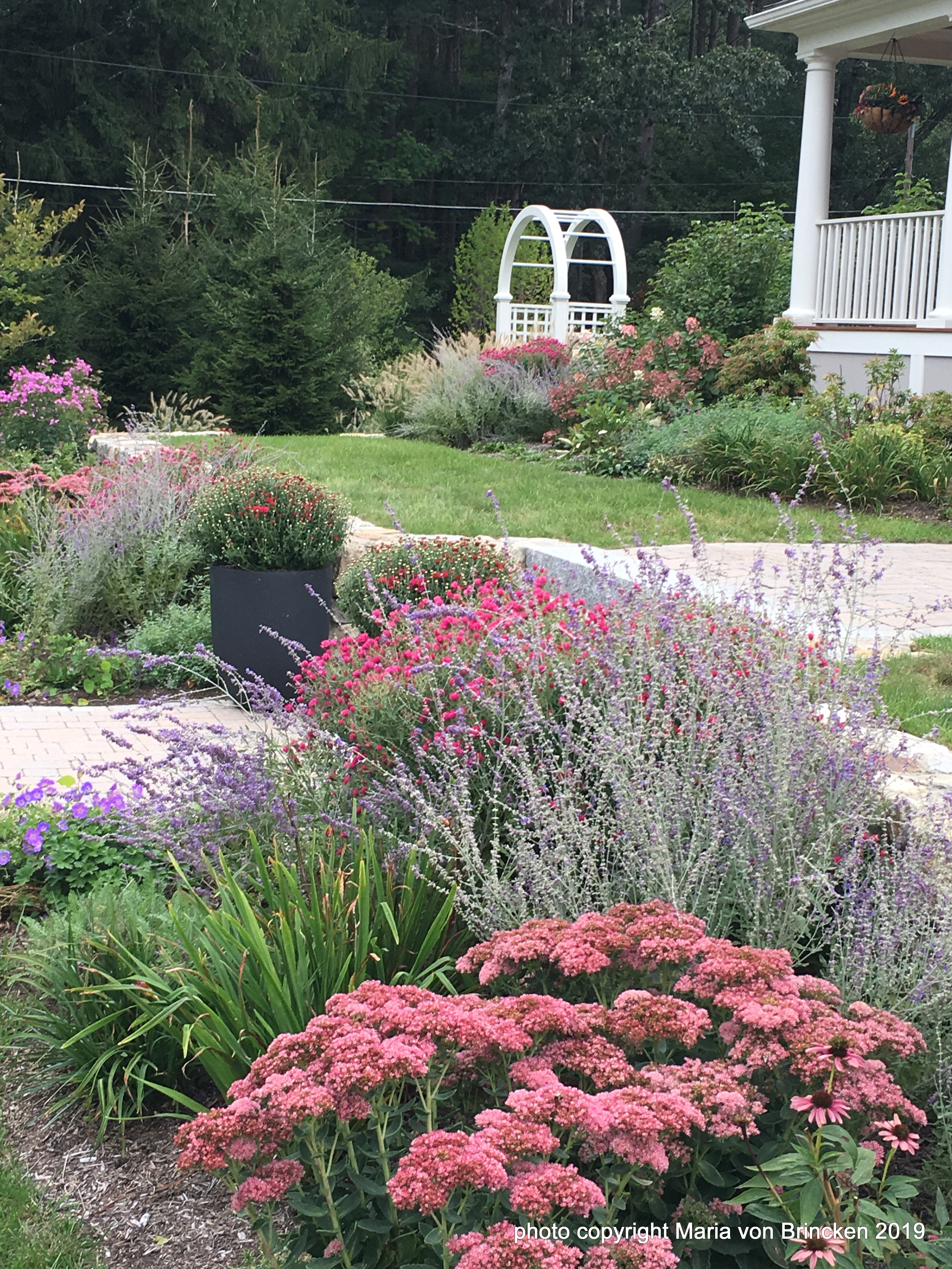 Wooden arbors, regional stone used for fieldstone steps and walls, and contemporary planters create the elements. Plant color palette honed to a set of complimentary hues paired with one more enhances the chosen focal color. Contemporary planting interweaves drifts of color and texture and form. Plant material inspired from “Pollinating meadow”, “country cottage”, and the use of ornamental grasses and all the above identify the style.